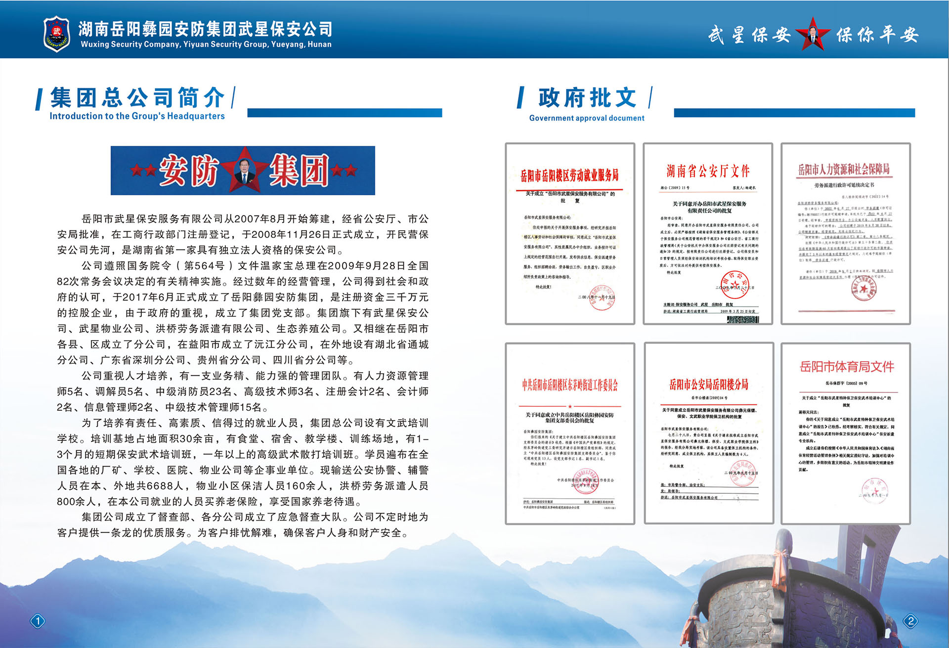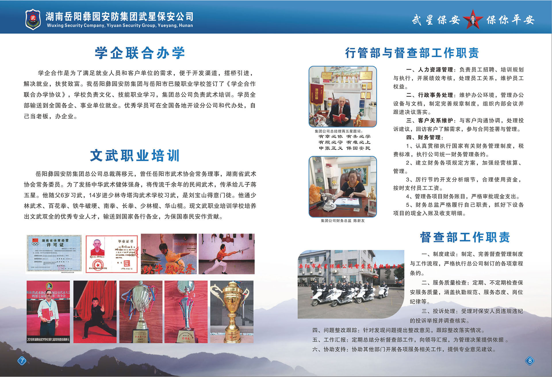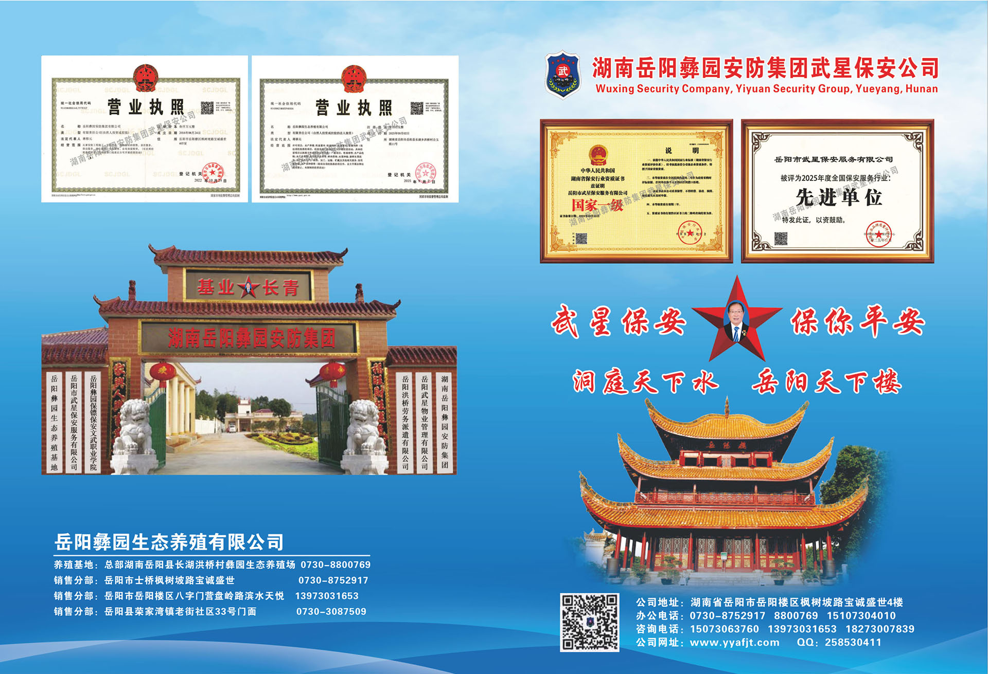 2017年6月正式成立了《岳陽(yáng)彝園安防集團(tuán)》,下設(shè)《武星保安公司》、《武星物業(yè)公司》、《洪橋勞務(wù)派遺公司》、《保鏢保安武術(shù)職業(yè)培訓(xùn)學(xué)校》等子公司